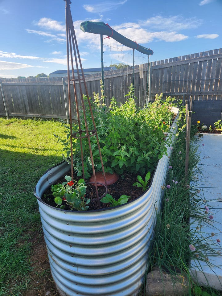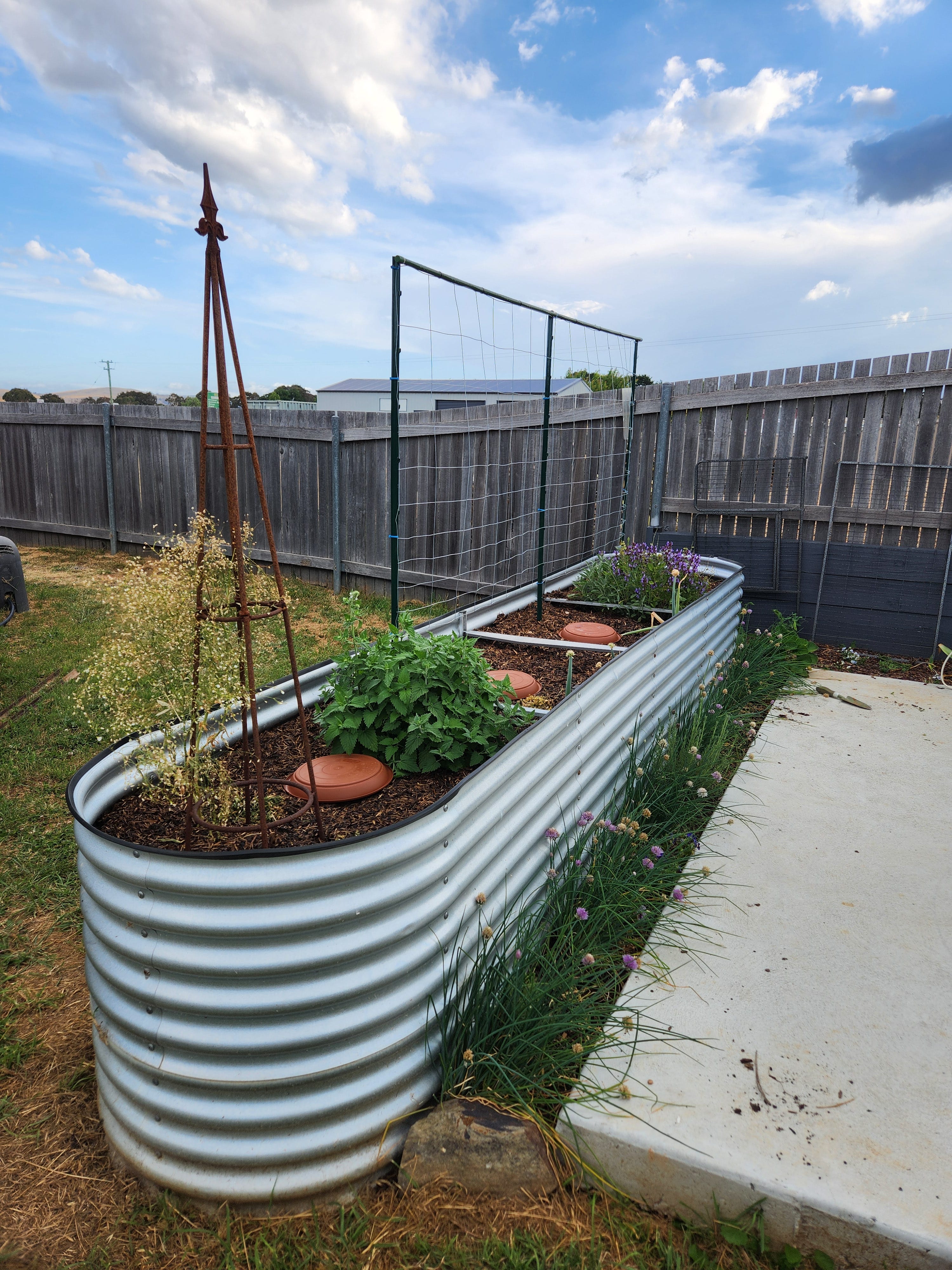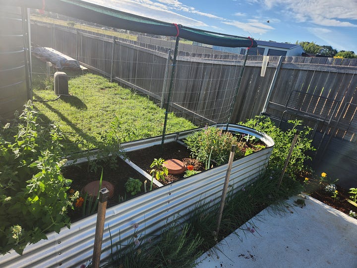 I’ve been wanting to grow tomatoes and cucumbers up a trellis so we constructed one from stakes and dog mesh. I’m trialling terra cotta pot ollas with plastic saucer hats as the veggie bed dries out quickly. While most of the seedlings I planted from the greenhouse seedlings failed (many had been knocked over and scattered in one storm and then burnt crispy by the summer sun), two calendula are growing well in the veggie bed, one of the pumpkins is looking healthy under the self-seeded tomatoes and the sunflowers are growing. The sage (Salvia officinalis) is flowering profusely as are the chives.