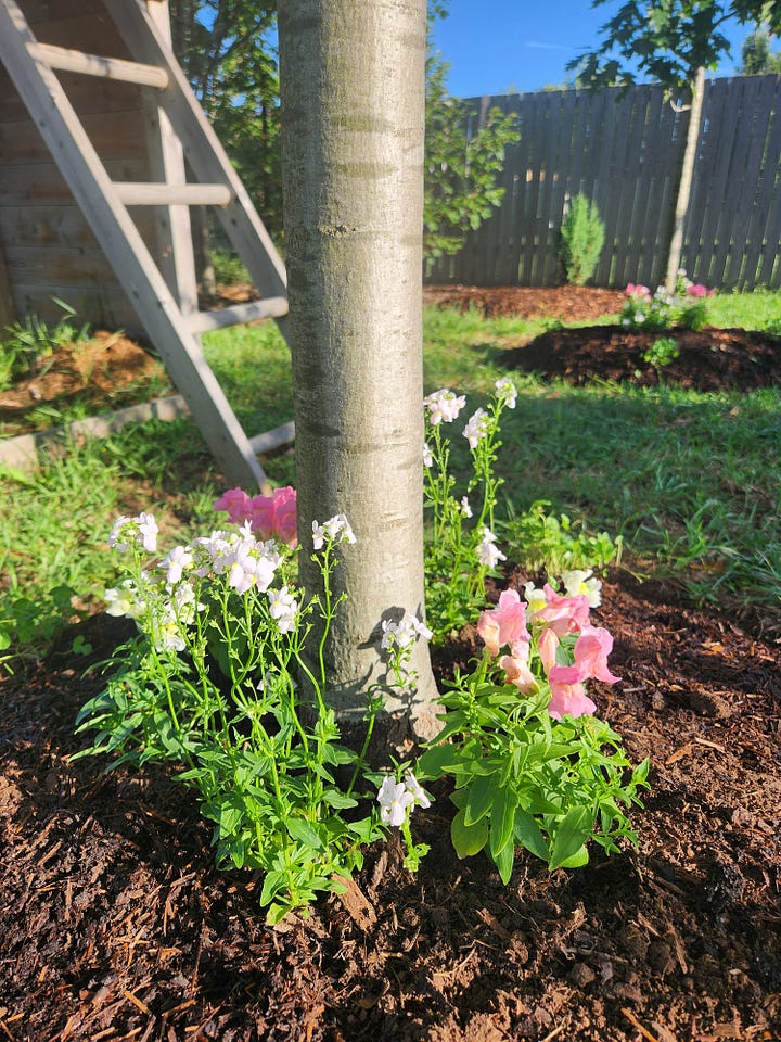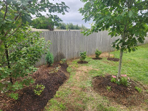 I also managed to weed under the oak trees and in the back half of the Canadian forest garden and I planted flowers and a groundcover to cheer up the space: