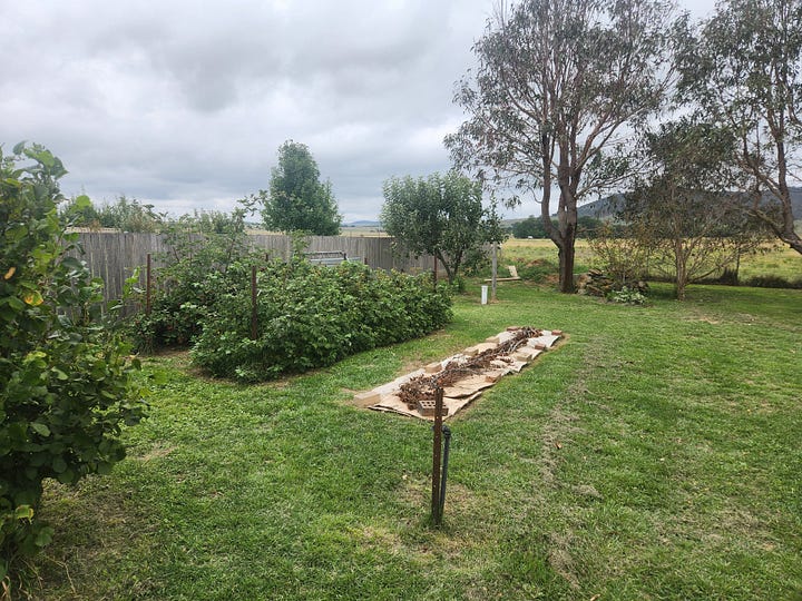 Two weeks of hot and dry weather desiccated the grass and we quickly rigged up a shade cloth to protect newly transplanted cherry tomatoes. By week 3, some fairly intense weather with hot and humid days culminated in localised storms and rain, which softened the ground and greened the landscape once more. According to the BOM, we are expected to have higher-than-average rainfall this season, for which I am grateful.